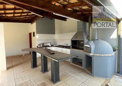 Área externa: churrasqueira, forno para pizza, 1 banheiro, quarto de despejo e varanda.